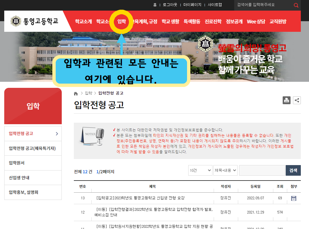 학교홈페이지 가장 위쪽 메뉴 [입학]에 있습니다.