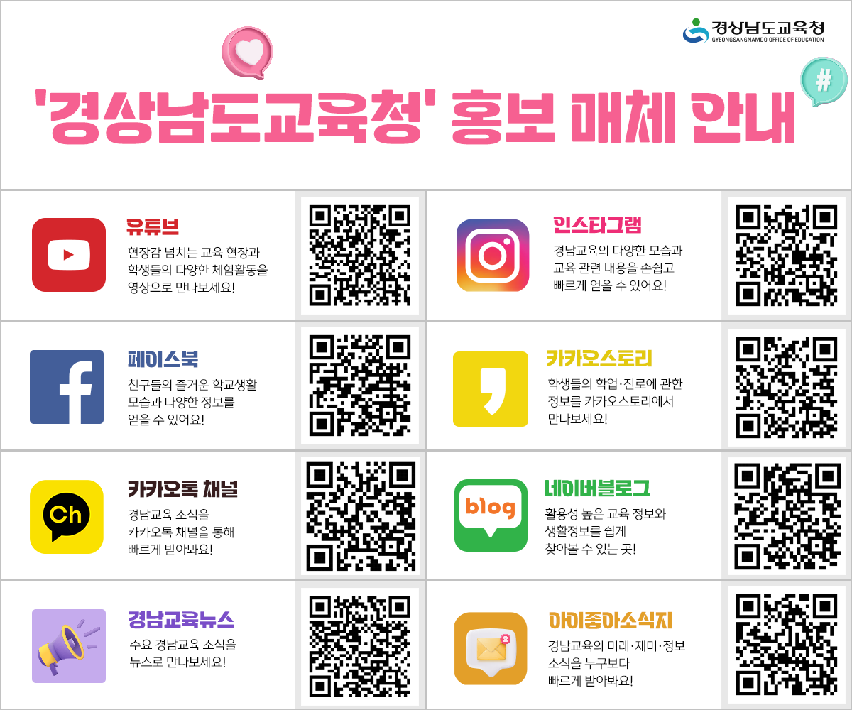 ■ 경남교육뉴스 경남교육 관련 주요 소식을 뉴스 형태로 제작 링크: https://www.youtube.com/playlist?list=PLA_ZNeE2Nk1DppxtCBGZ3_gJGFsRIDgBz ■ 네이버 블로그 활용성 높은 교육 정보와 생활정보를 기사 형태로 제공 링크: https://blog.naver.com/gne_education →이웃추가 클릭 ■ 유튜브 생생한 교육 현장의 모습과 다양한 교육 정보 제공 링크: https://www.youtube.com/@gne_education →구독 클릭 ■ 인스타그램 다양한 경남교육 활동 소식 및 교육 정보 제공 링크: https://www.instagram.com/gne_education/ →팔로우 클릭 ■ 페이스북 웹툰, 카드 뉴스로 교육 소식 및 교육 정보 제공 링크: https://www.facebook.com/gneducation/ →팔로잉 클릭 ■ 카카오스토리 진로, 학업 등 교육 정보와 경남교육 소식 제공 링크: https://story.kakao.com/ch/gnedu →소식받기 클릭 ■ 카카오톡 채널 교육 정보 생활 정보를 소식지처럼 메세지 형태로 구독 링크: https://pf.kakao.com/_exeens →채널추가 버튼 클릭 ■ 아이좋아 소식지 경남교육공동체 소식, 유익한 정보 등을 잡지와 웹진 형태로 제공 링크: https://magazine.gne.go.kr/magazine/main.do →오른쪽 상단 구독신청 클릭
