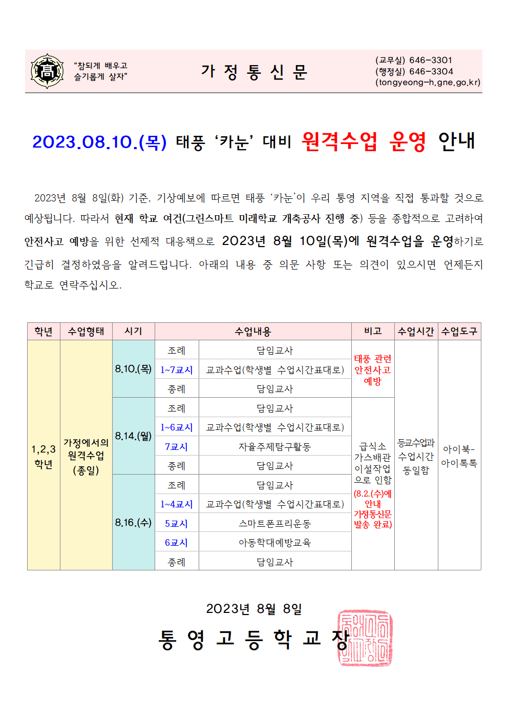 2023년 8월 8일(화) 기준, 기상예보에 따르면 태풍 ‘카눈’이 우리 통영 지역을 직접 통과할 것으로 예상됩니다. 따라서 현재 학교 여건(그린스마트 미래학교 개축공사 진행 중) 등을 종합적으로 고려하여 안전사고 예방을 위한 선제적 대응책으로 2023년 8월 10일(목)에 원격수업을 운영하기로 긴급히 결정하였음을 알려드립니다.